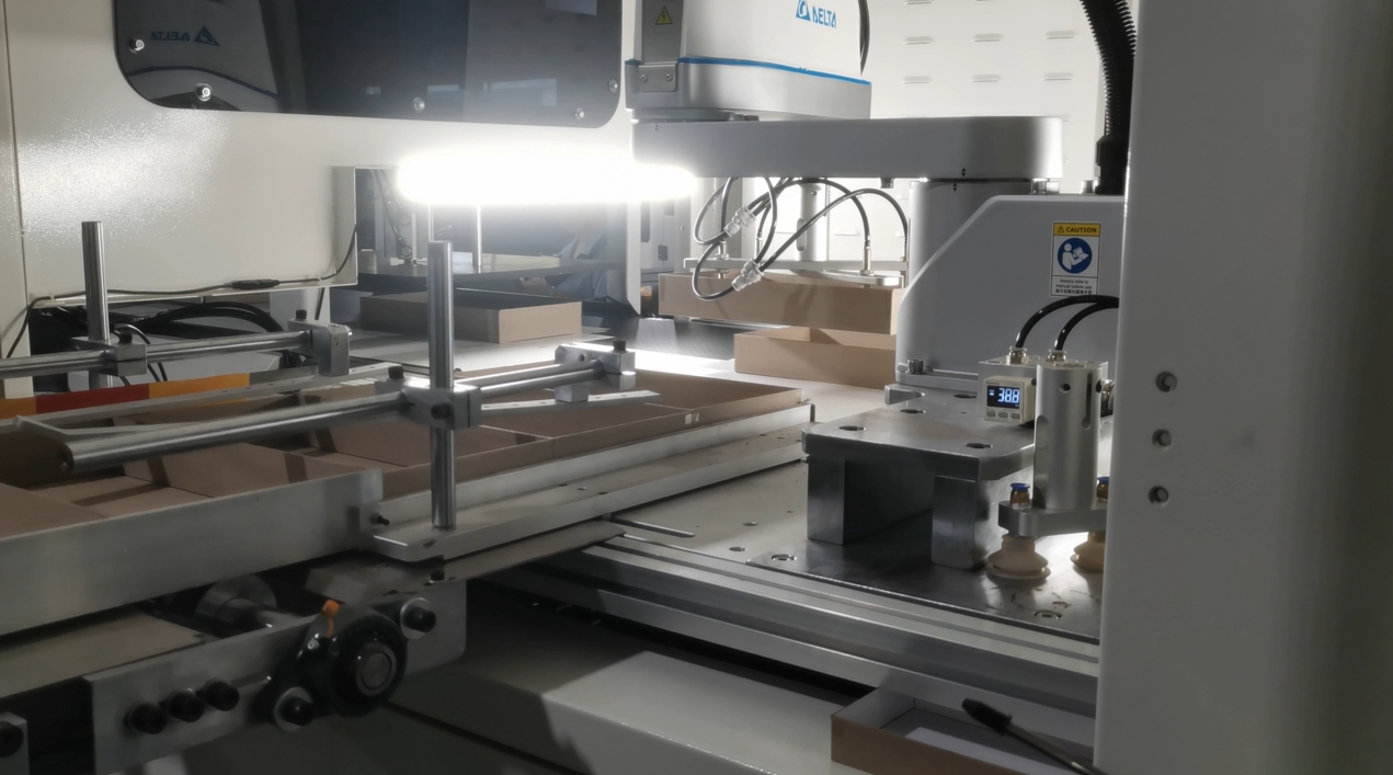 面紙印刷好以后,需要在自動成型機上加工天地蓋包裝盒的上蓋和下蓋,機器自動沖壓紙板成包裝盒的五個面,如下圖,然后機械手會將盒型與面紙對位粘貼等系列作業(yè),使得包裝盒具備初步的樣子。