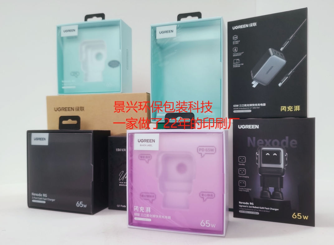 上圖的多款綠聯科技UGREEN的充電器包裝盒均為我司印刷加工的,其中用到了比較常見的燙金工藝,具體綠聯科技的相關視頻可查看http://m.sqrmzs.com/video/