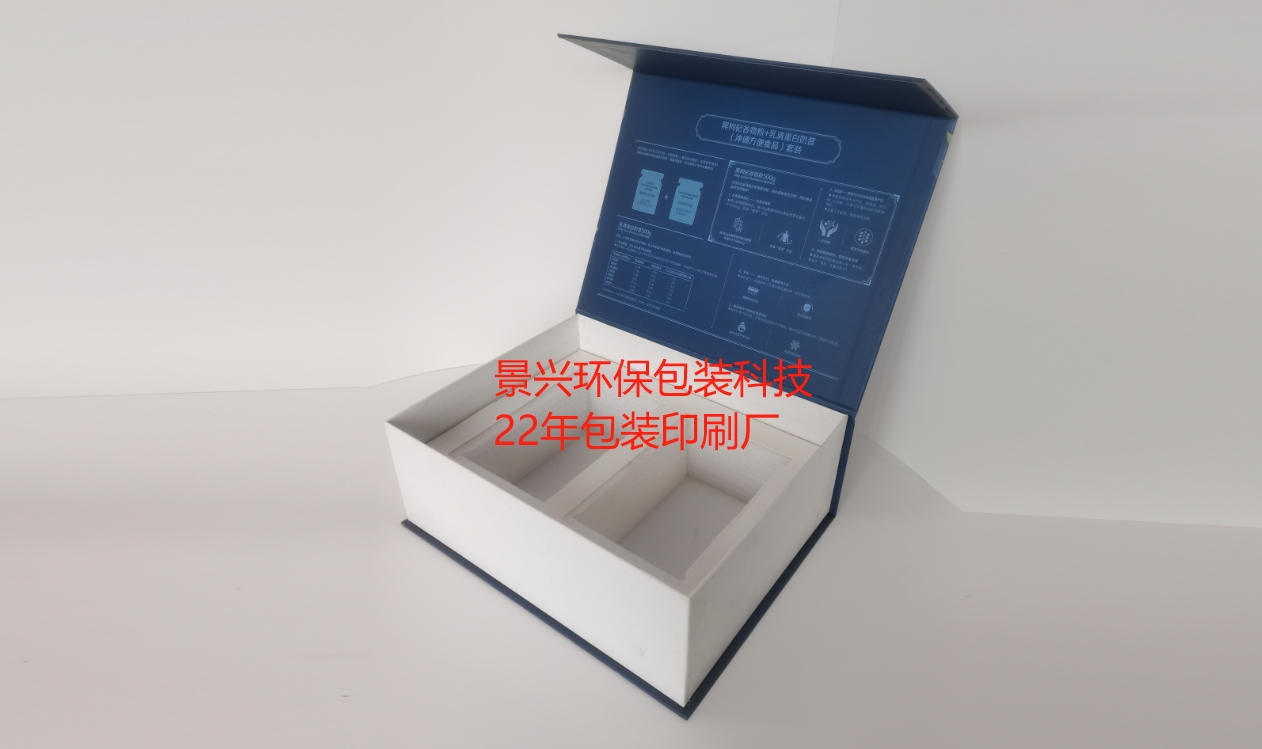 上圖是五谷磨房的食品禮盒包裝,是由我司東莞市景興環(huán)保包裝科技有限公司印刷的,盒型采用的翻蓋式,配合海綿內(nèi)托,對(duì)包裝盒內(nèi)的兩罐裝食品起到保護(hù)的作用,整體結(jié)果非常簡(jiǎn)單,但包裝盒在印刷工藝上采用了比較亮眼的燙金工藝,紙張也是以裱紙+硬紙板相結(jié)合,能在保護(hù)產(chǎn)品的同時(shí)提升質(zhì)感。