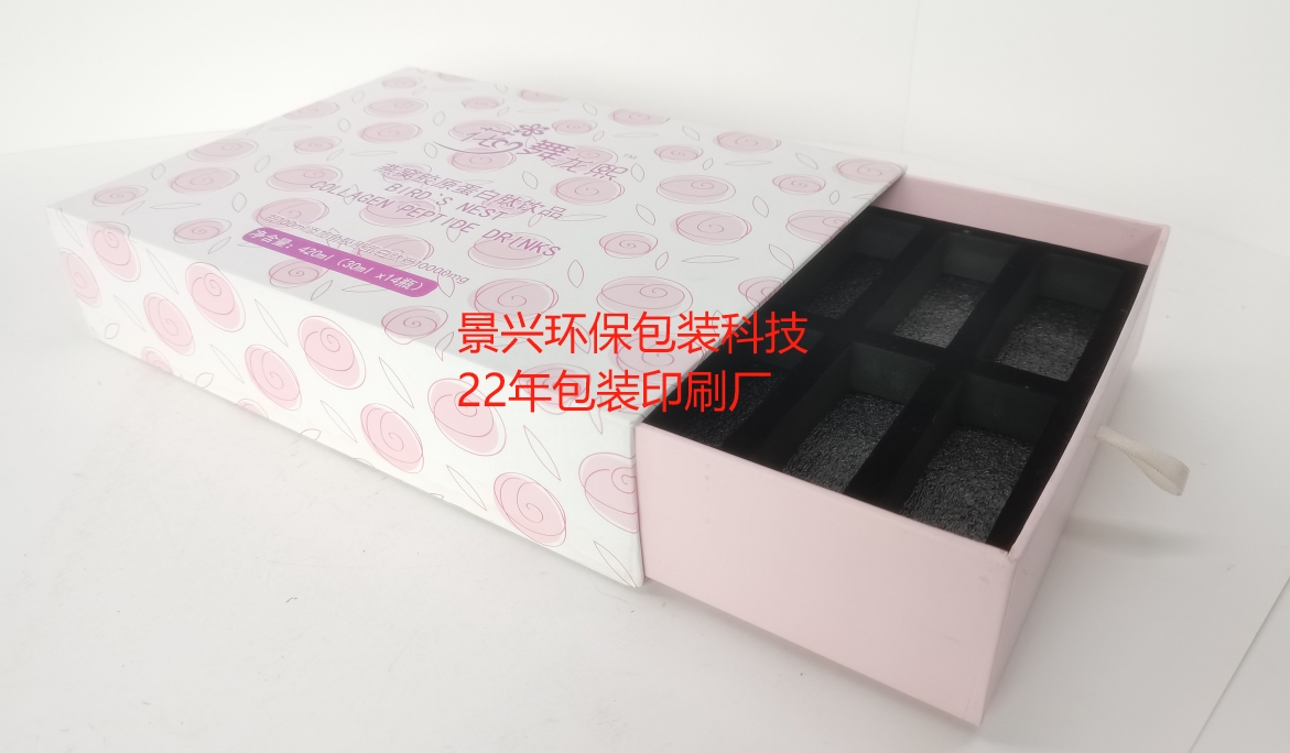 又比如下面這款食品印刷包裝盒,這款是以抽屜的盒型結(jié)構(gòu)來(lái)設(shè)計(jì)的,也是配了內(nèi)托。