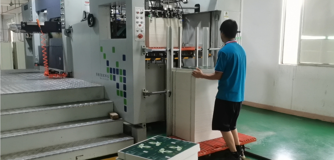 燙金師傅正在對包裝盒進(jìn)行半自動燙金作業(yè),景興包裝有著4條半自動燙金作業(yè)產(chǎn)線。